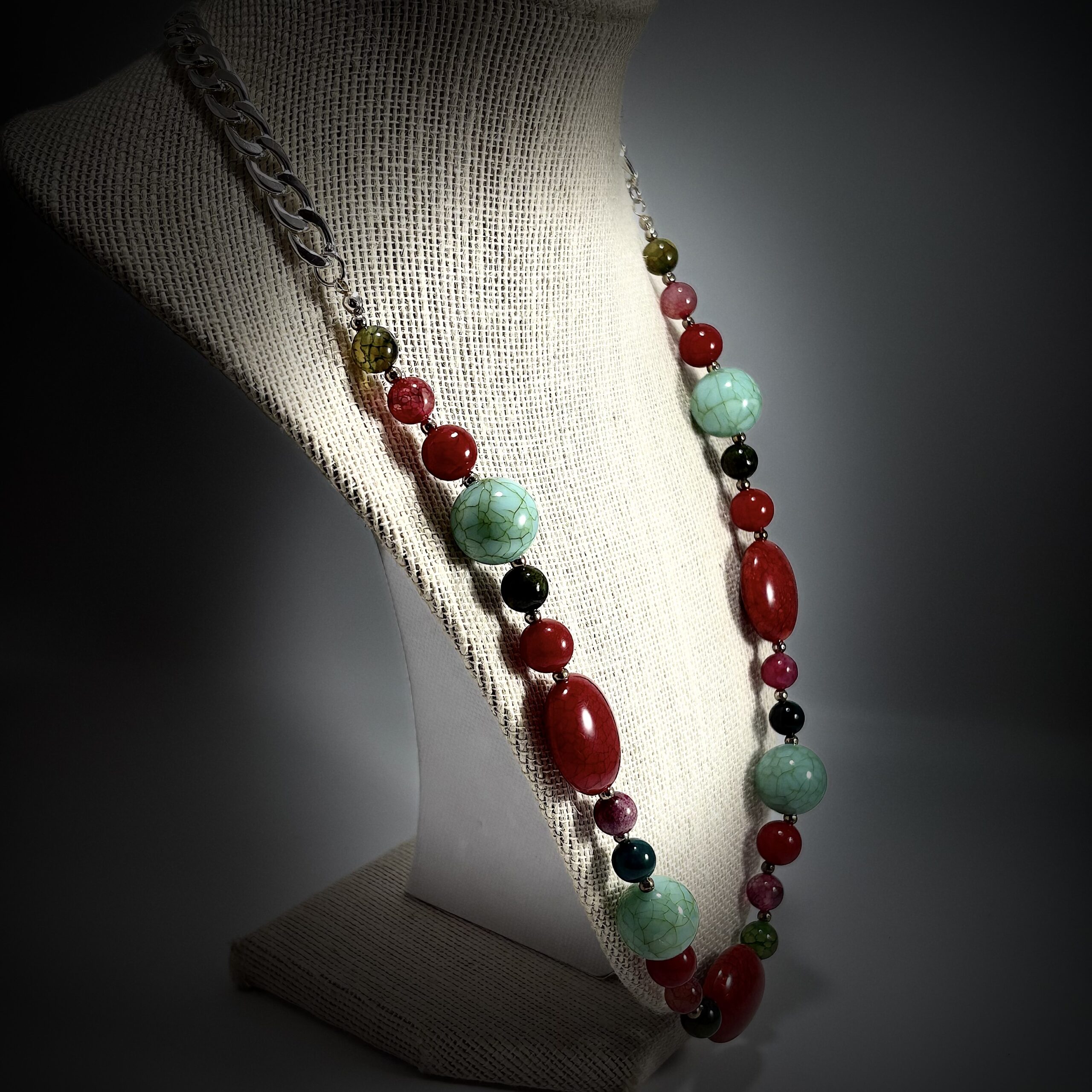 This design refers to the magical and natural tones of greens, reds, and turquoises of the necklace. Its chain in 925 silver-plated tone gives the design elegance and strength while blending with harmony, serenity, and luxury.